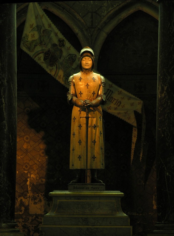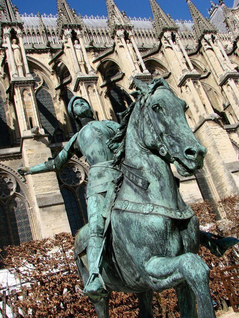 The Cathedral was heavily damaged during Word War I. This image is of a postcard from 1915, showing the cathedral on fire after attacks. (1915, public domain)Two statues of Joan of Arc can be seen at the Reims Cathedral. The first, of Joan on horseback, is located outside the cathedral.